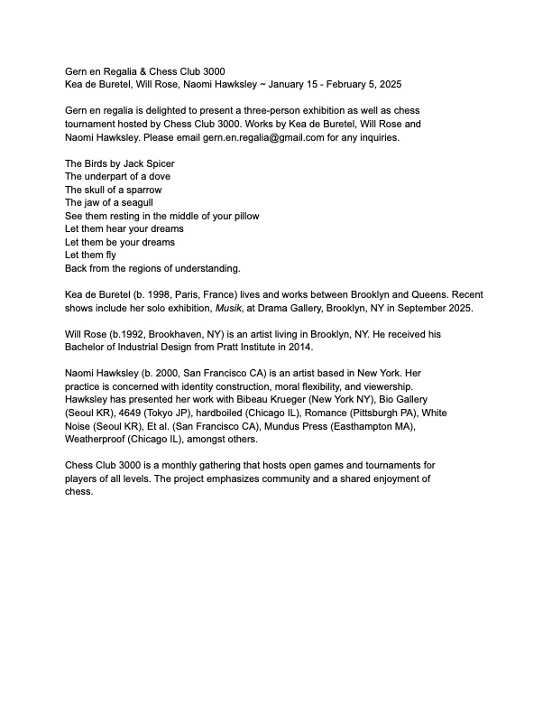 Chess Club 3000 and Gern en Regalia~ Kea de Buretel, Will Rose, Naomi Hawksley ~ January 15th - February 5th, 2026.