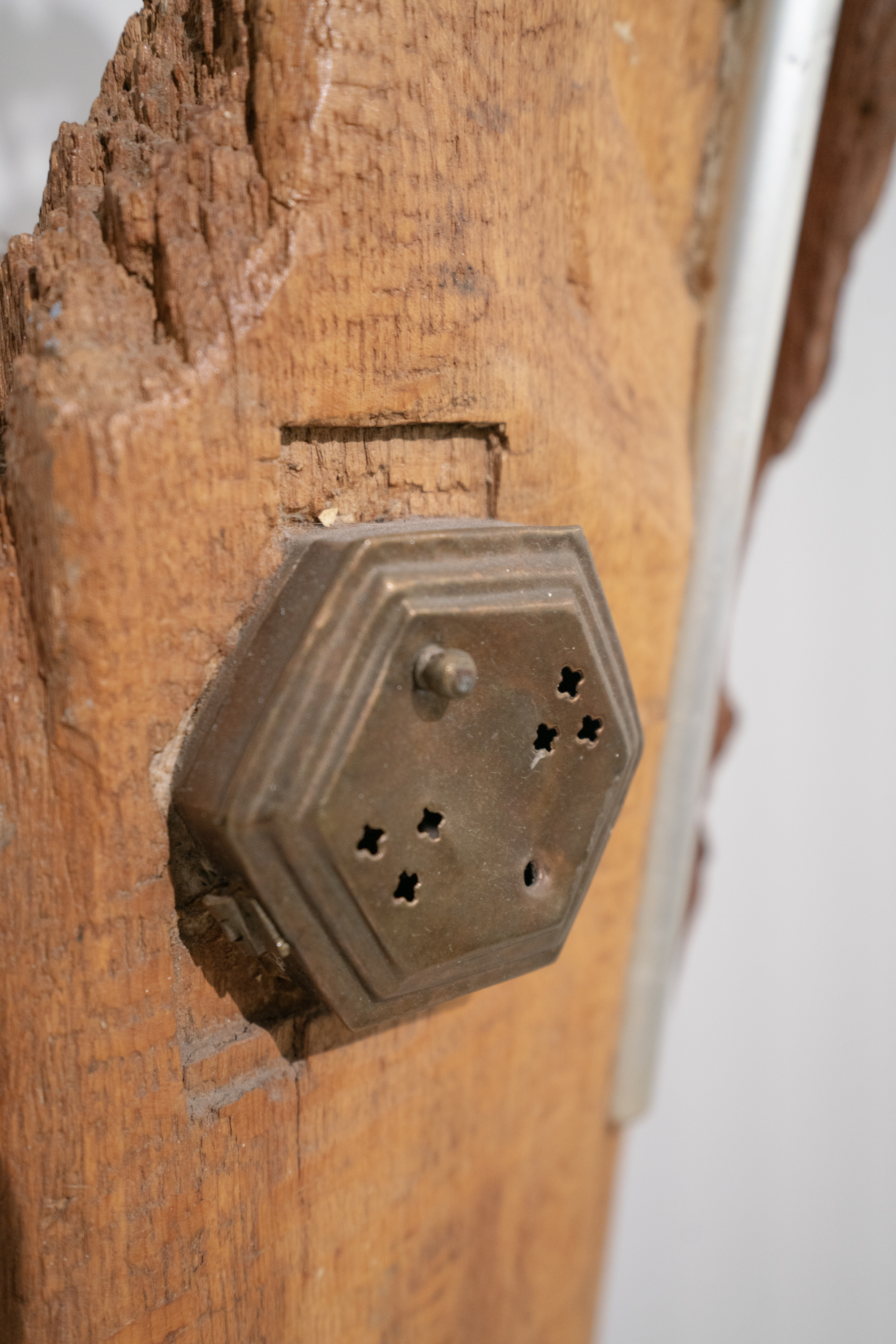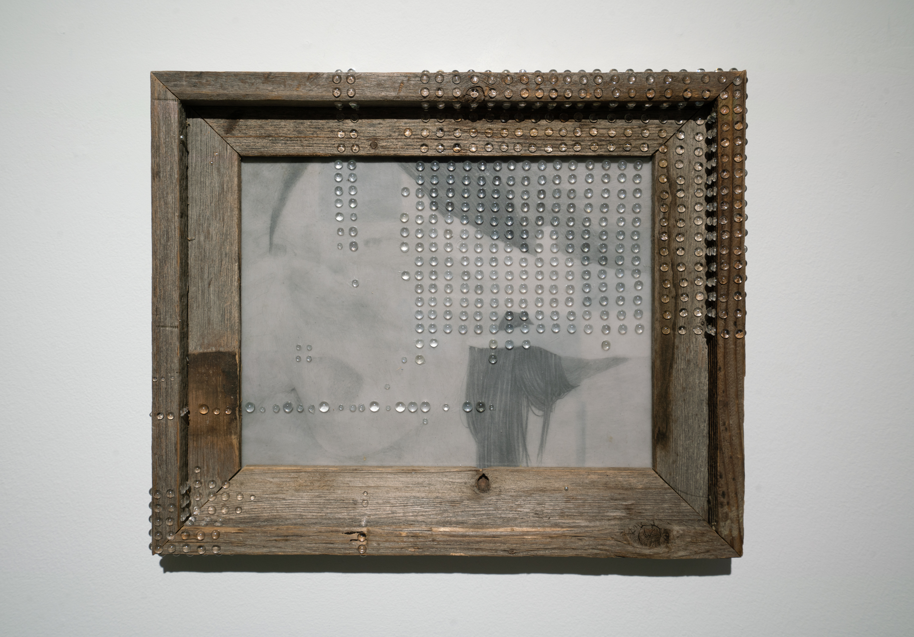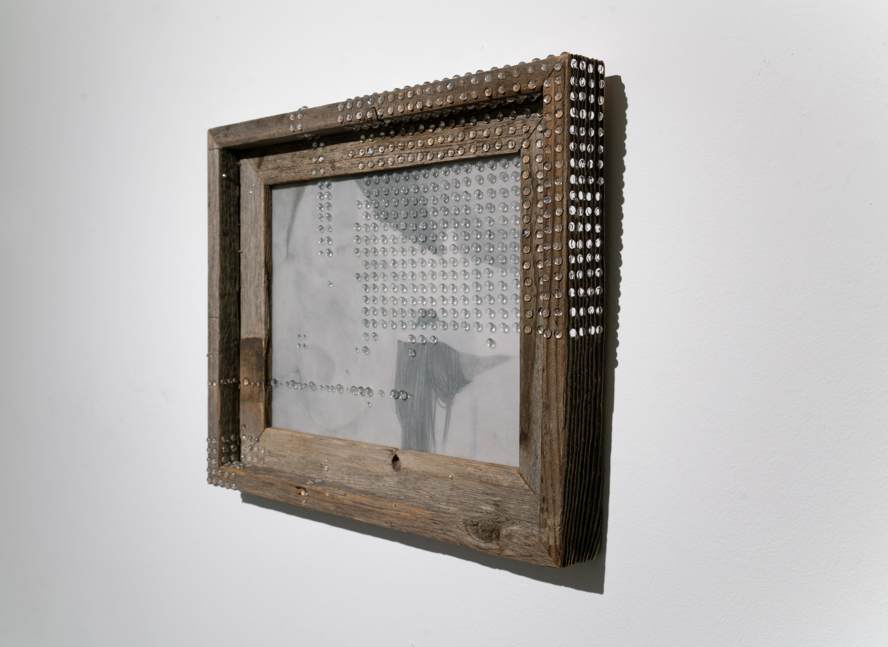 Naomi Hawksley. Untitled (All -Over) . Graphite on vellum and newsprint, acrylic, adhesive, plated metal, glass, reclaimed wood. 10.75 x 13.25". 2026.