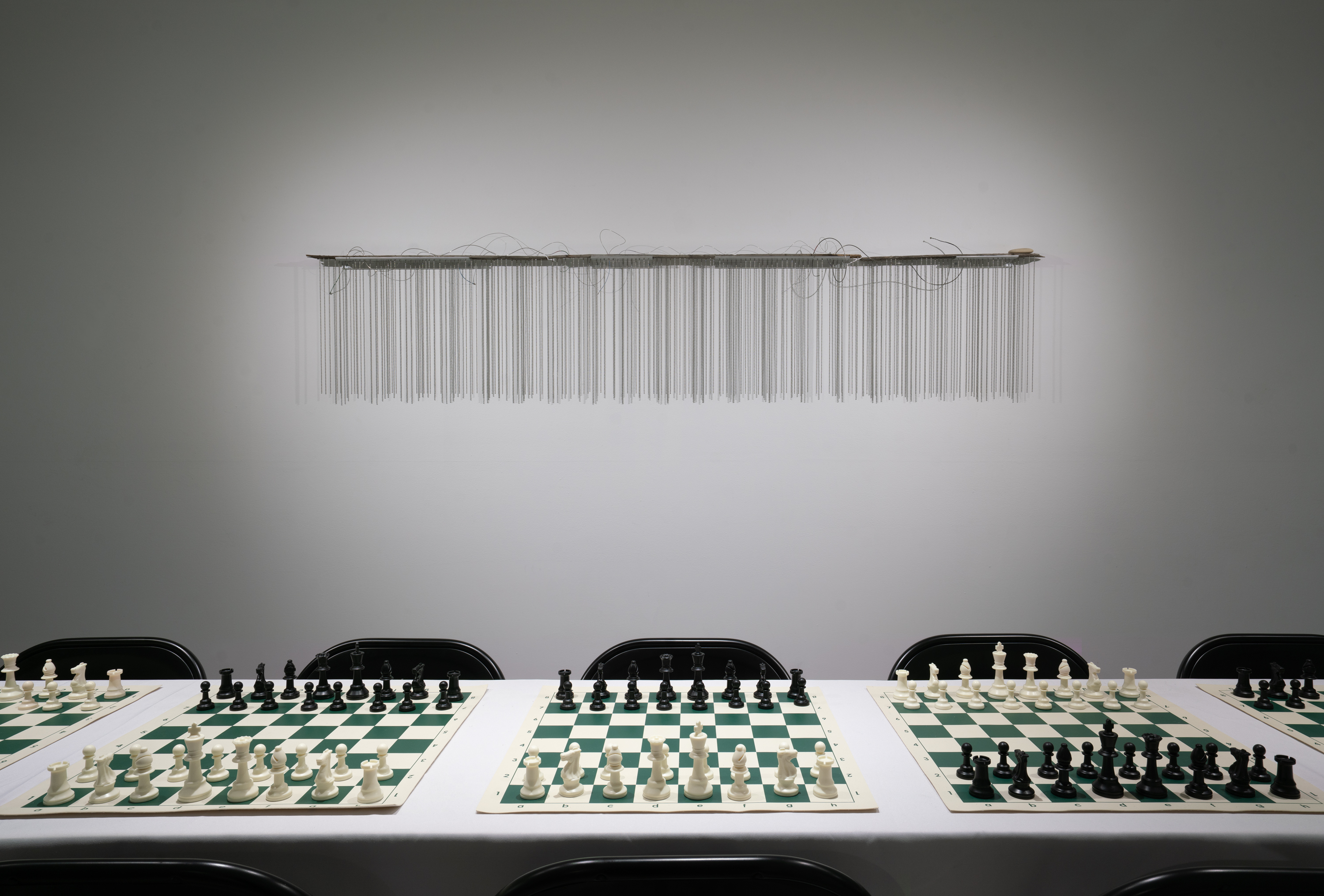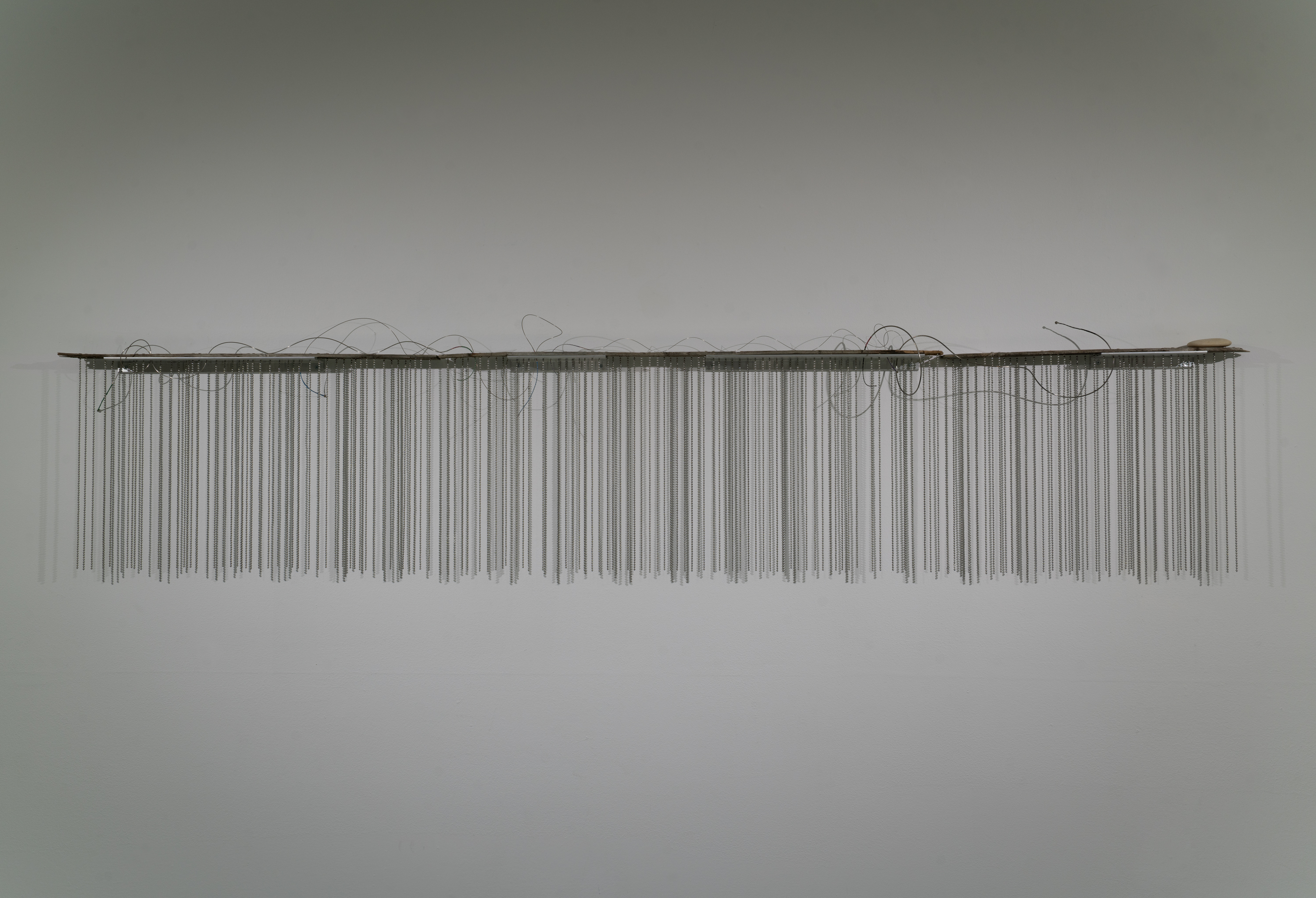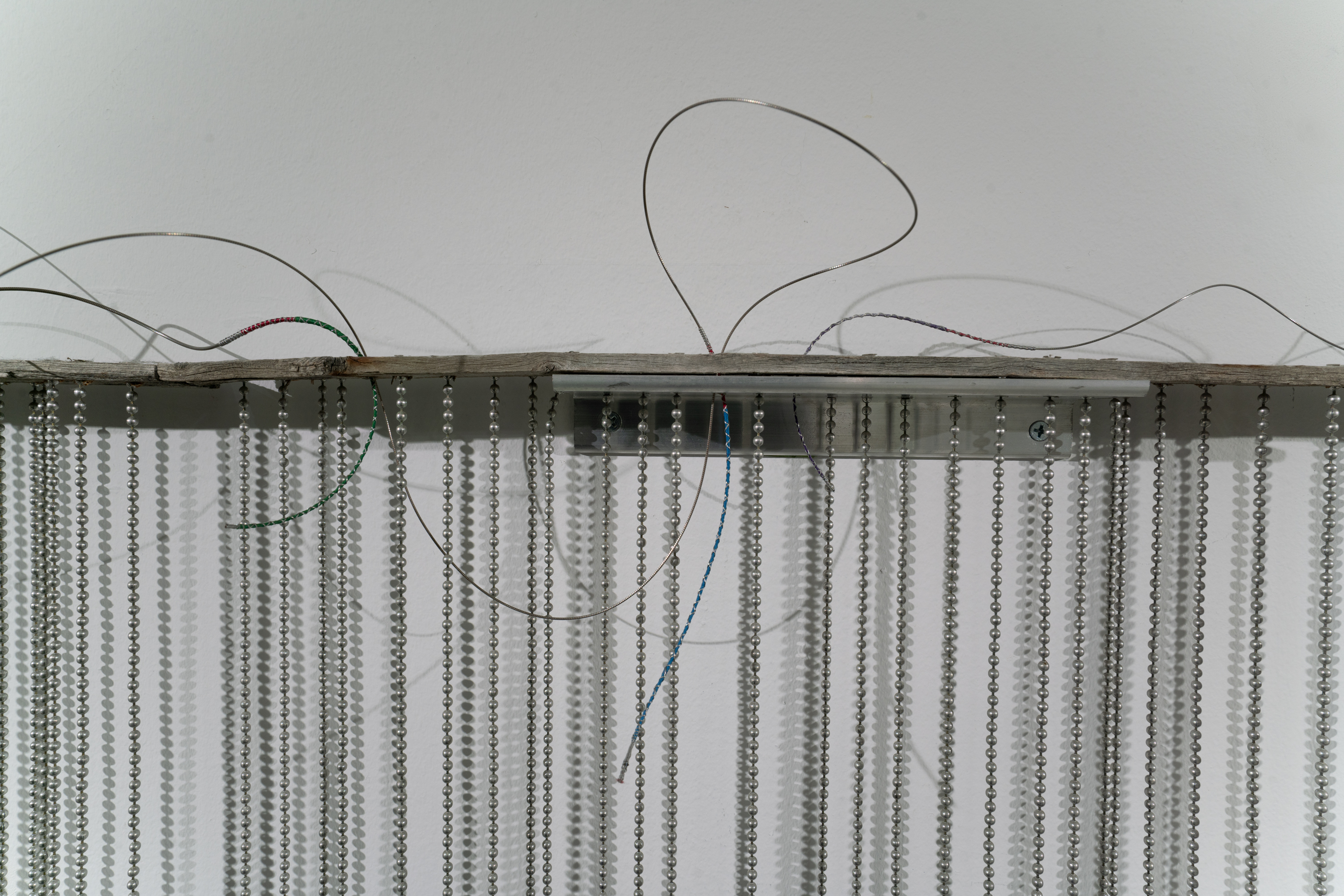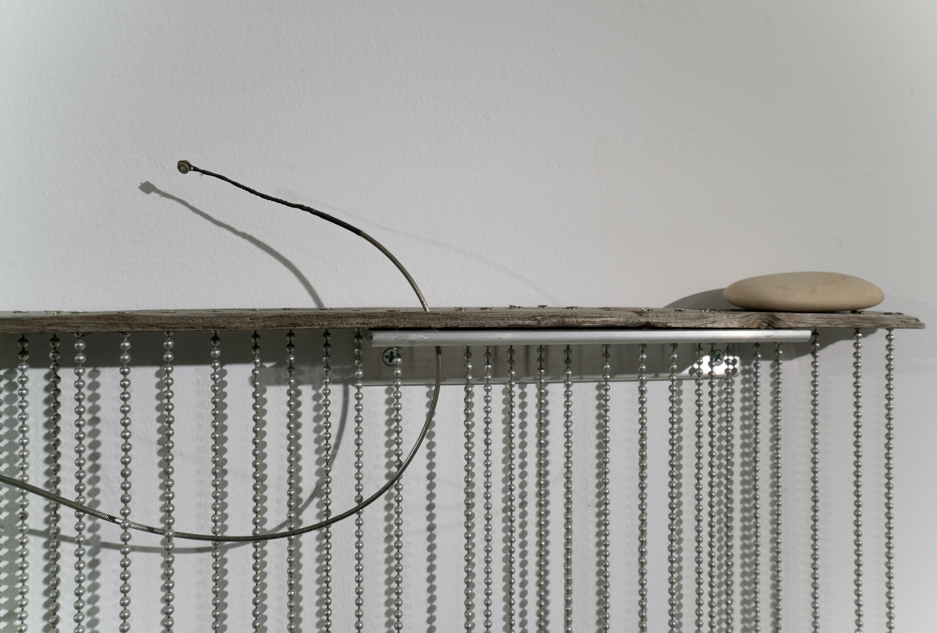 Will Rose. Untitled . ball chain, aluminum, dune fence, cello strings, stone. 80 x 17 x 2". 2019.