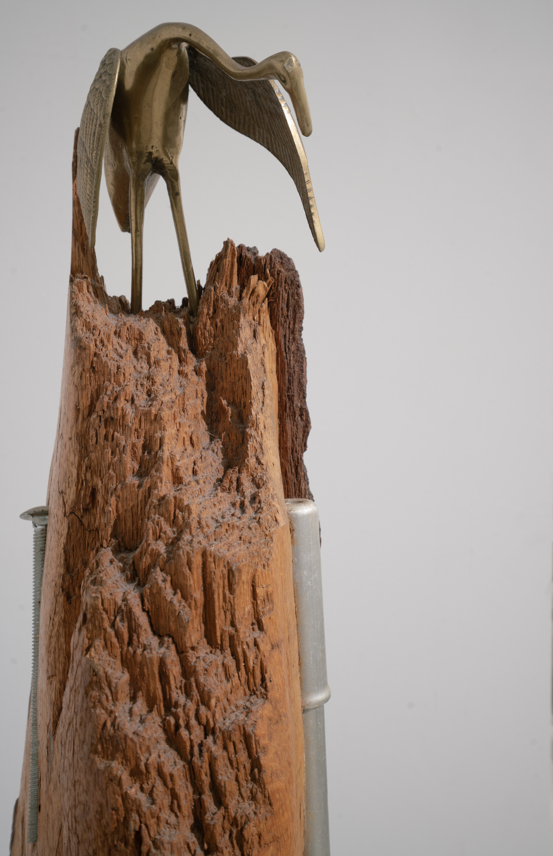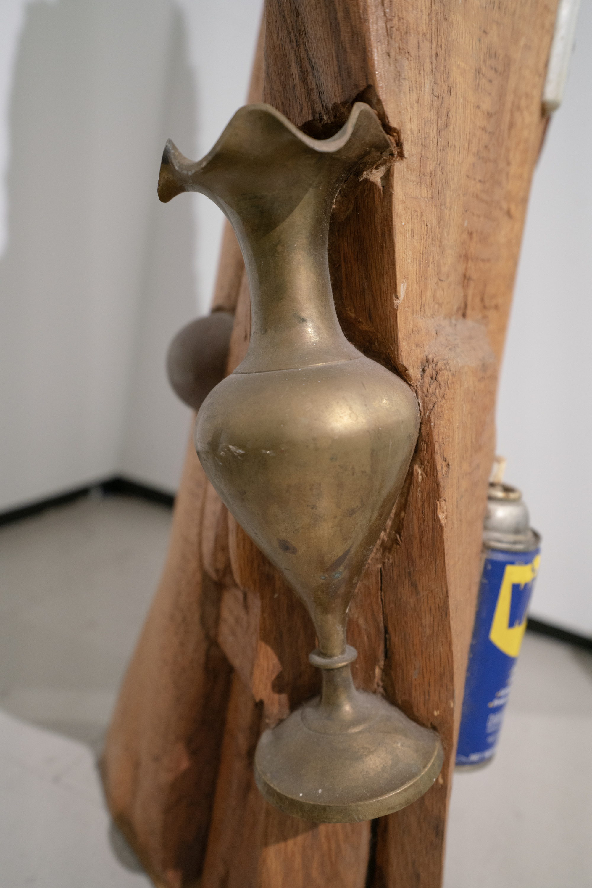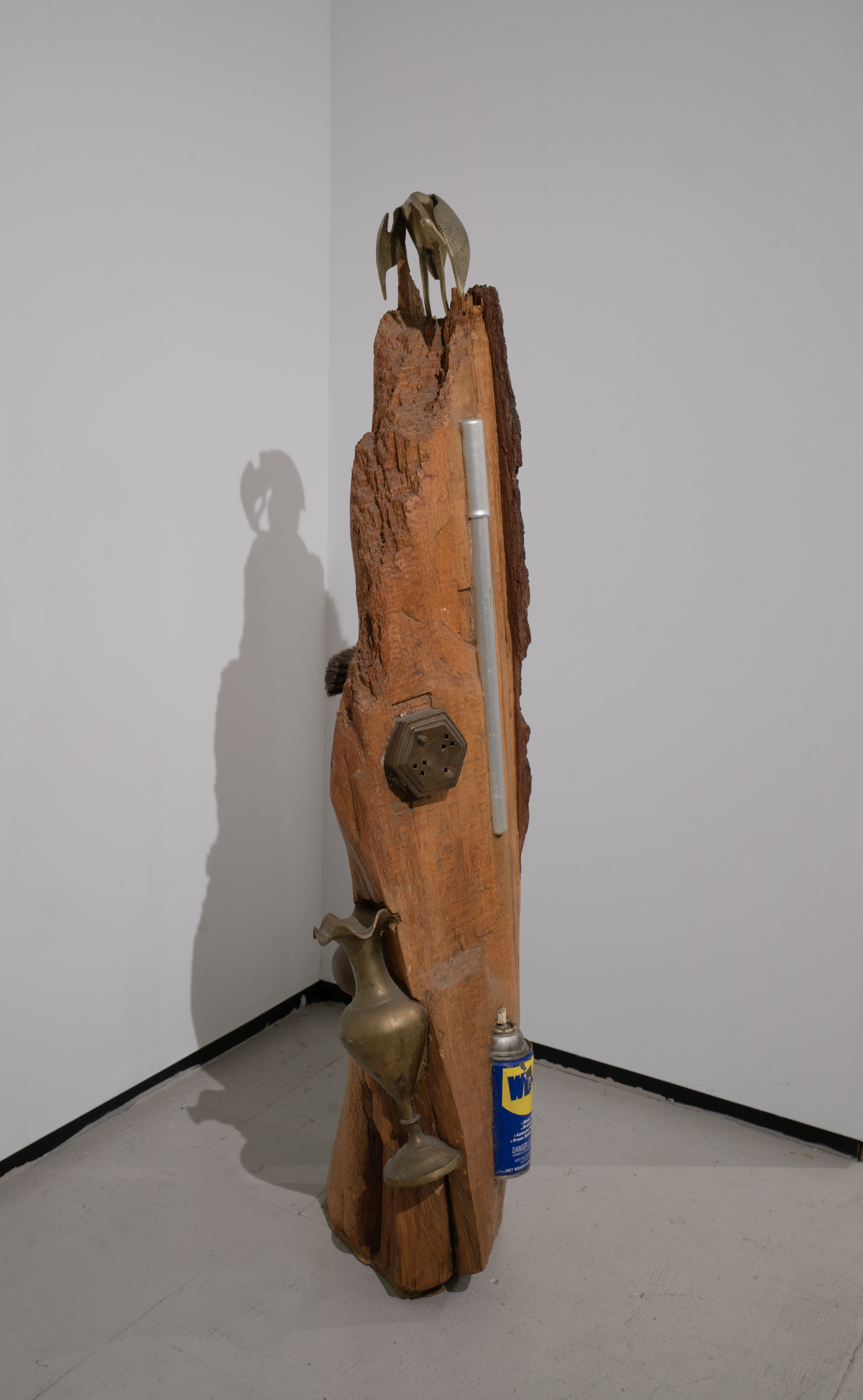 Found Object . log, brush, pipe, vase, wd40, cricket box, crane figurine. 42 x 10 x 9"