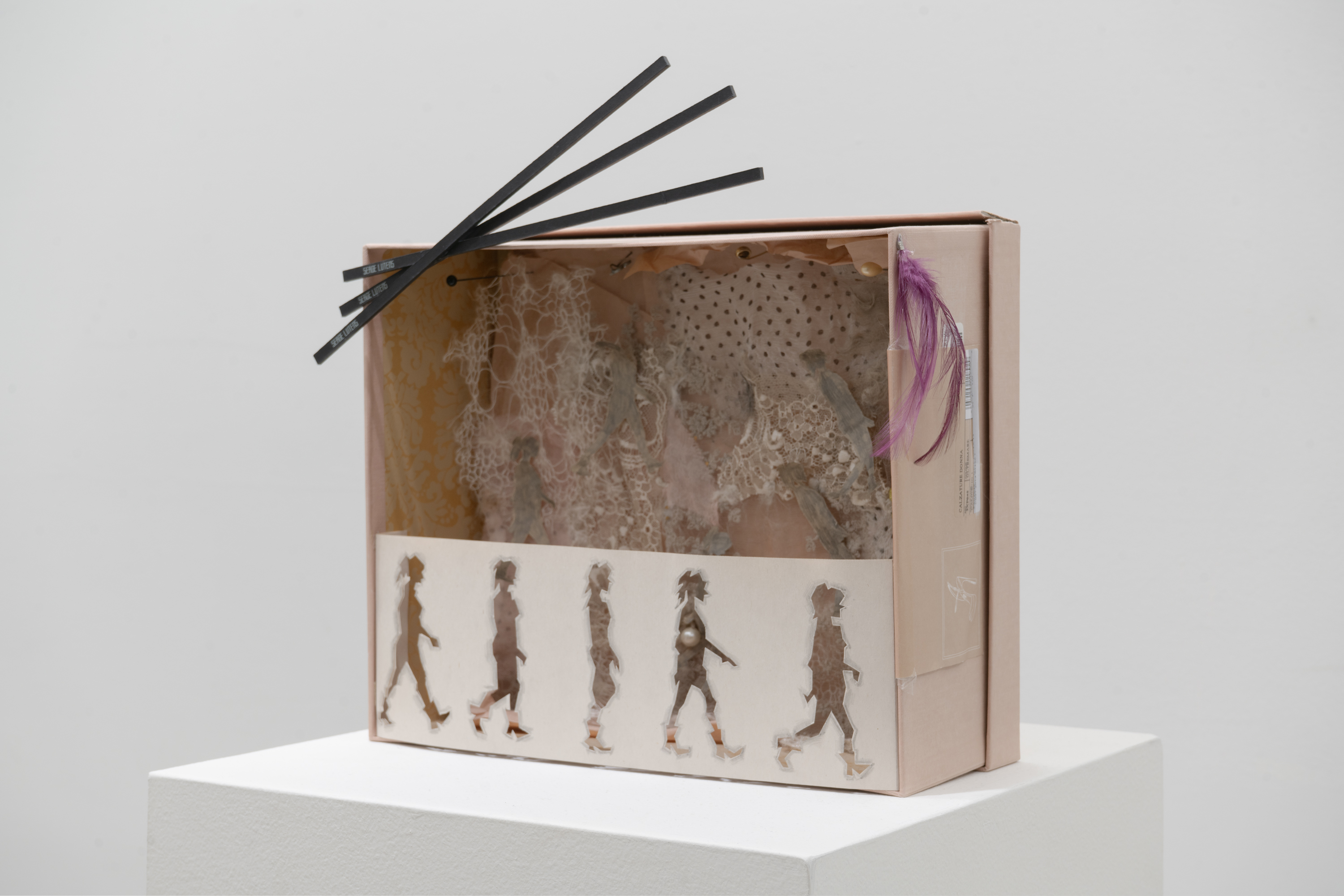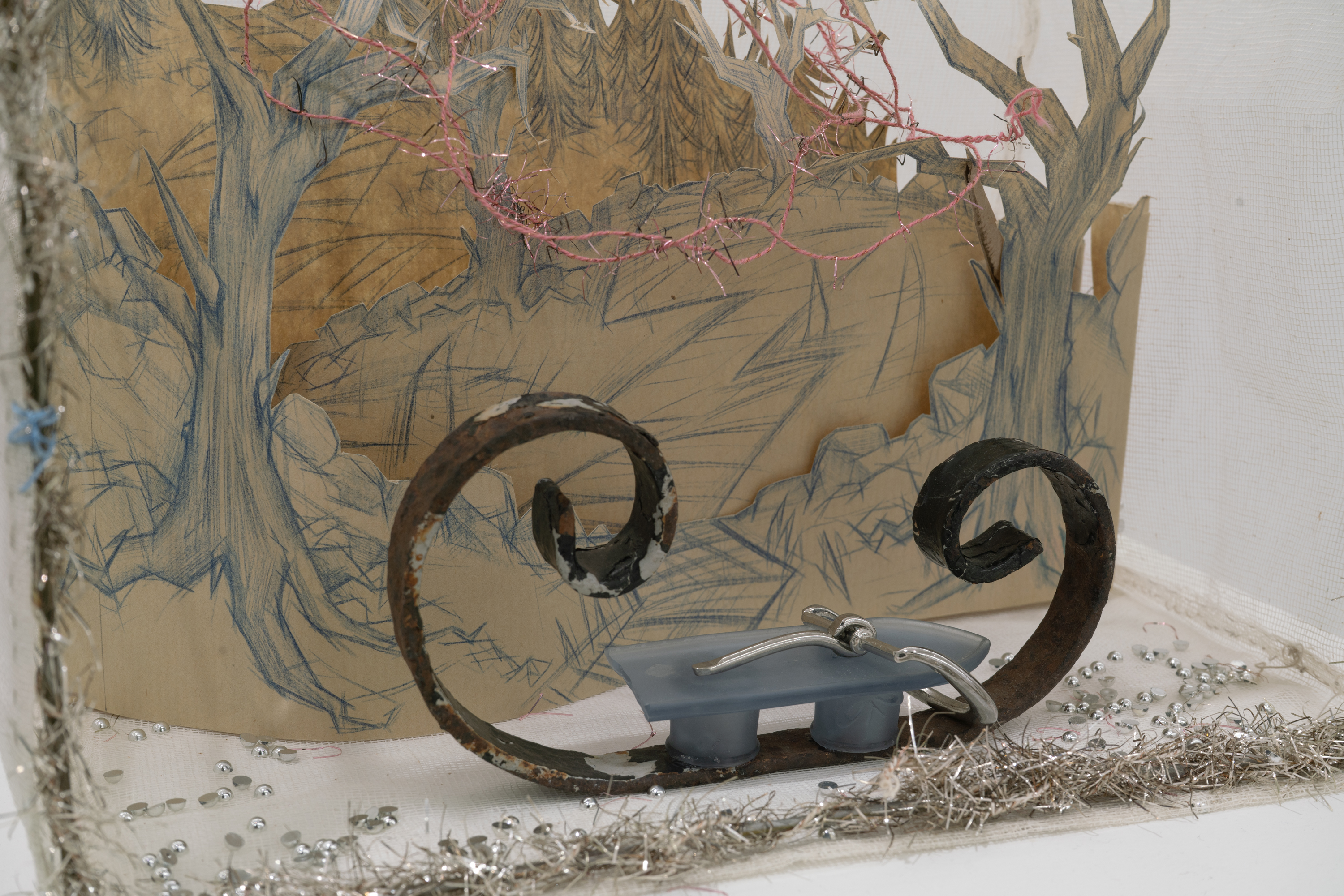 Isabella Kressin and Connor Bokovay. Notes on a Pity Injury . Diorama: fabric, wire, iron, ink on paper, belt, beads. 2024.