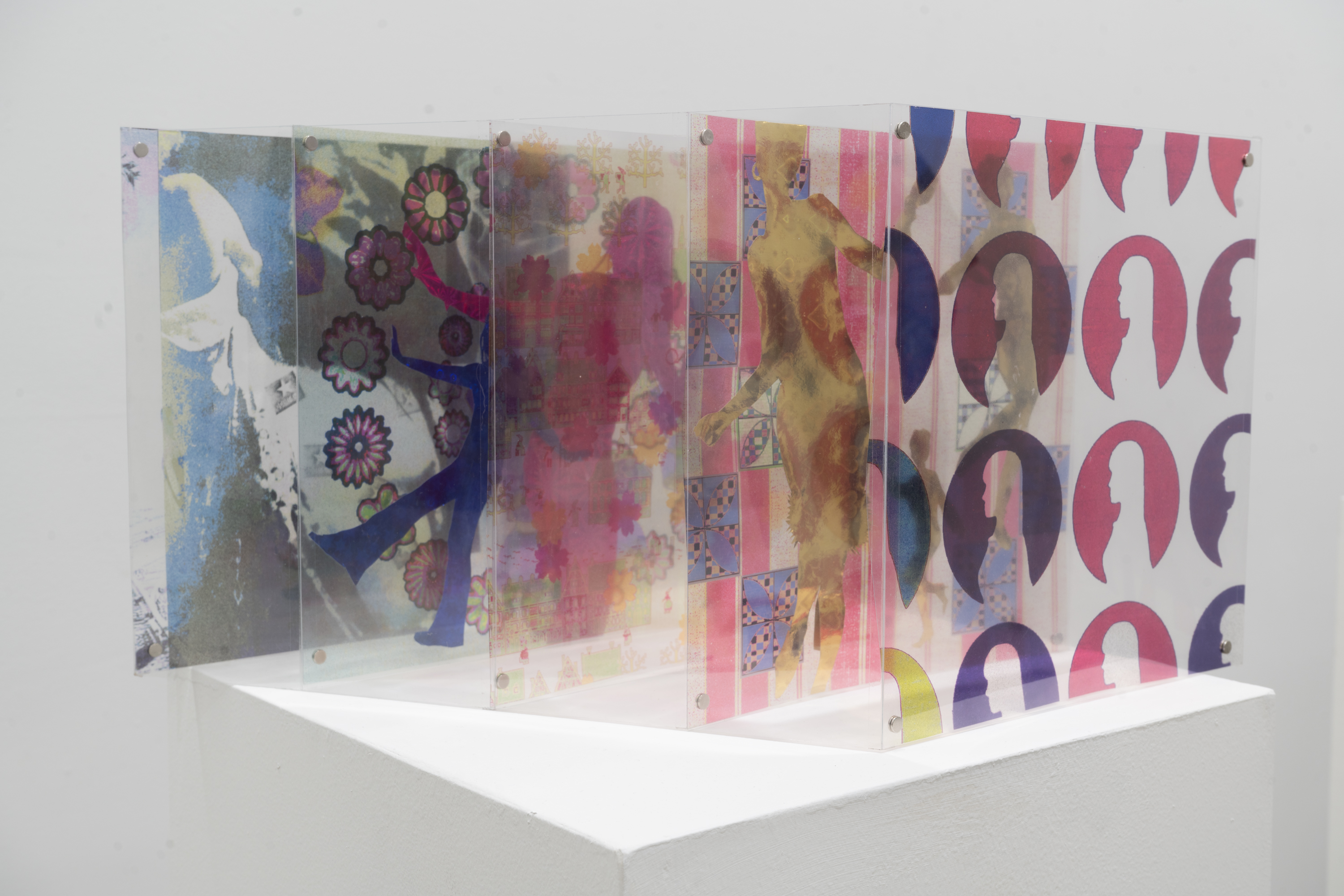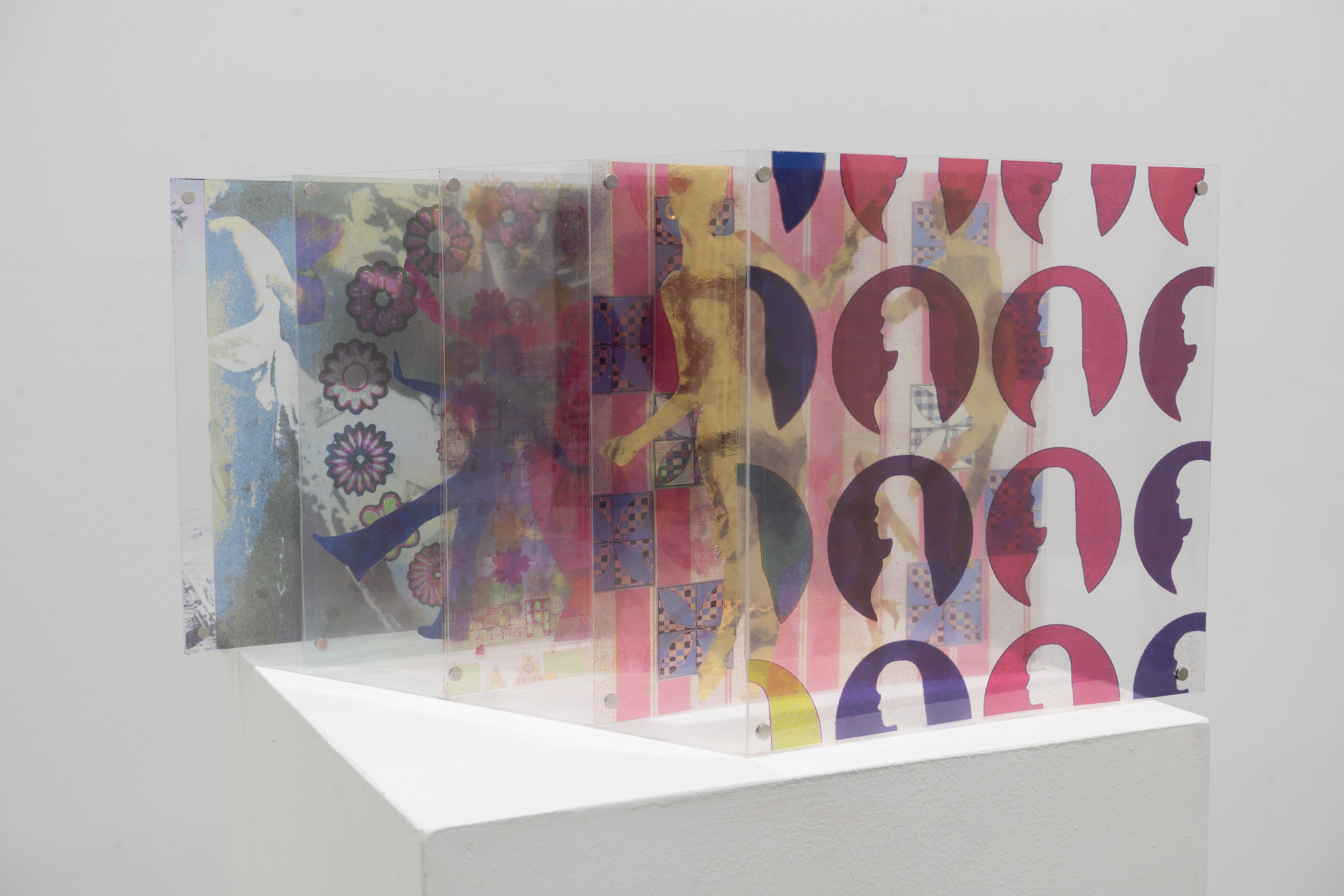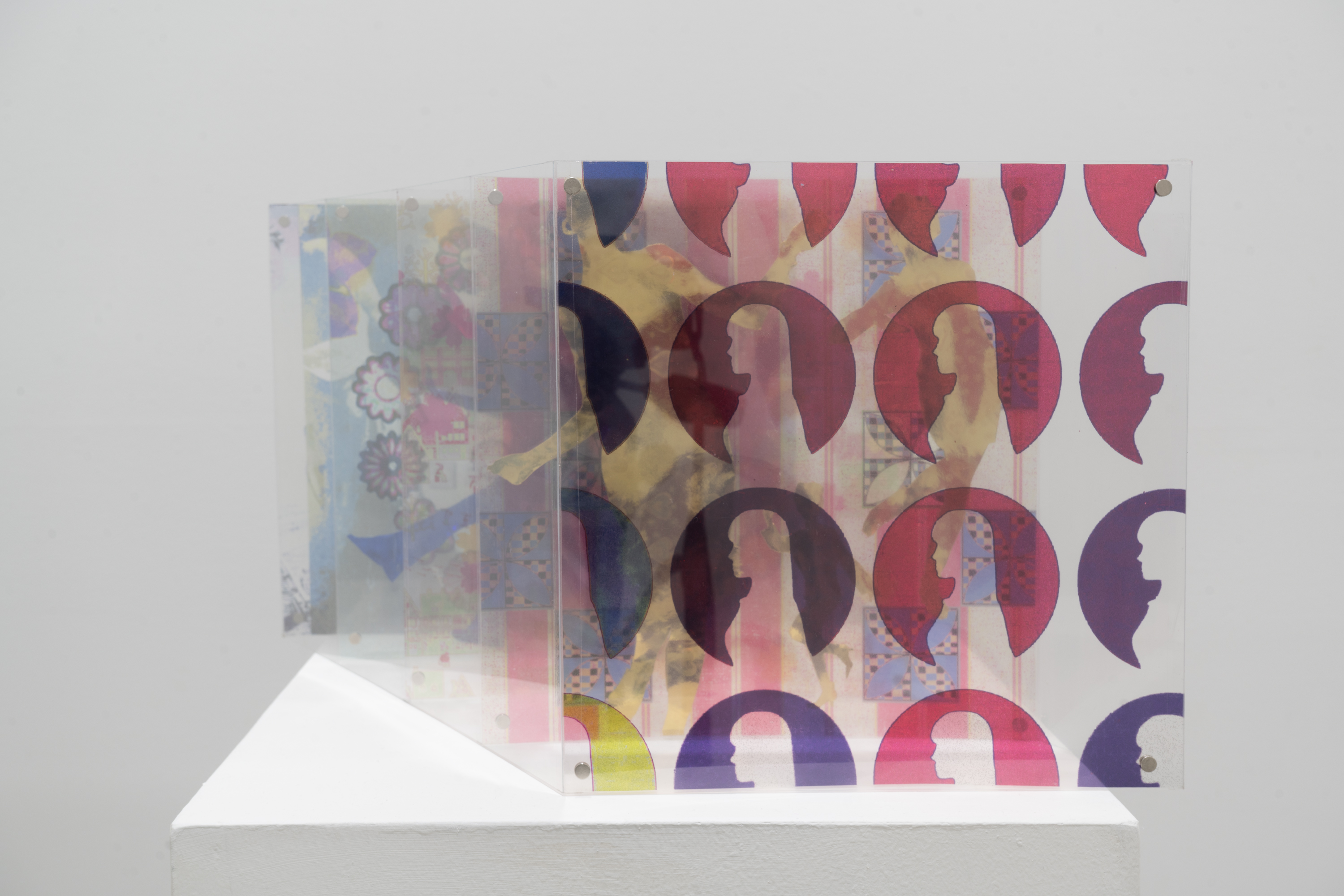 Isabella Kressin. Shimmering Information . Wood, fabric, inkjet print on transparency sheet, tape, glue. 2026