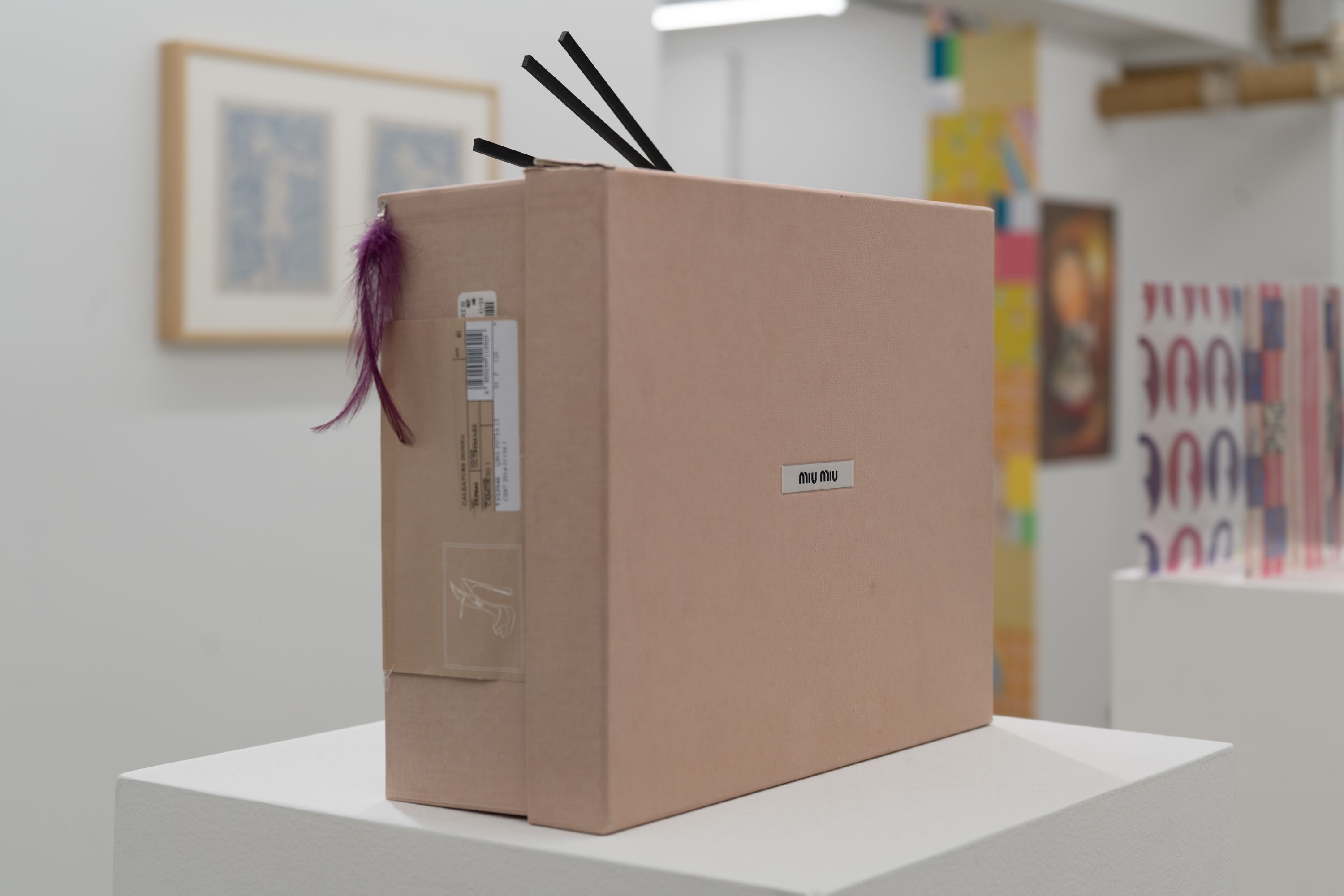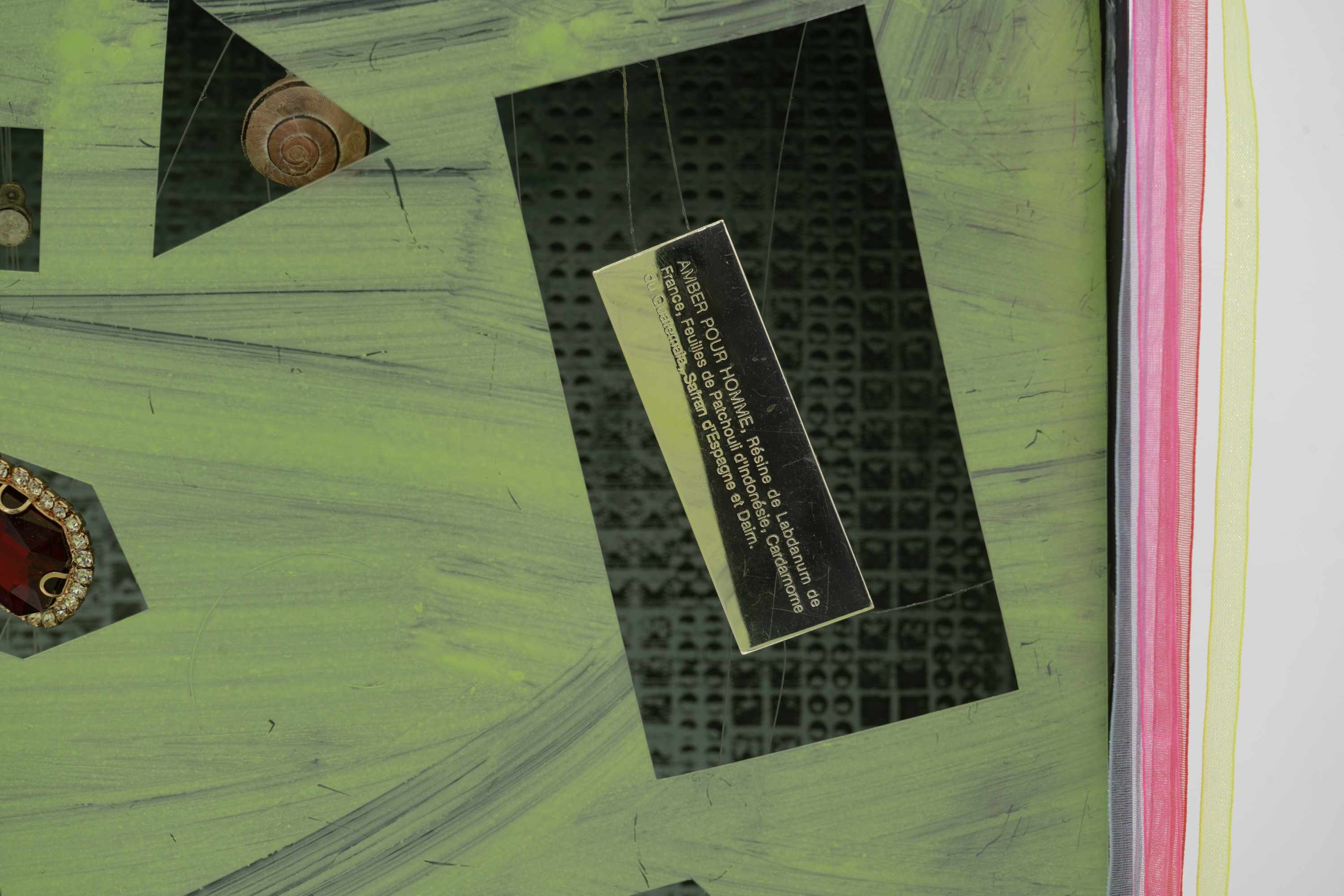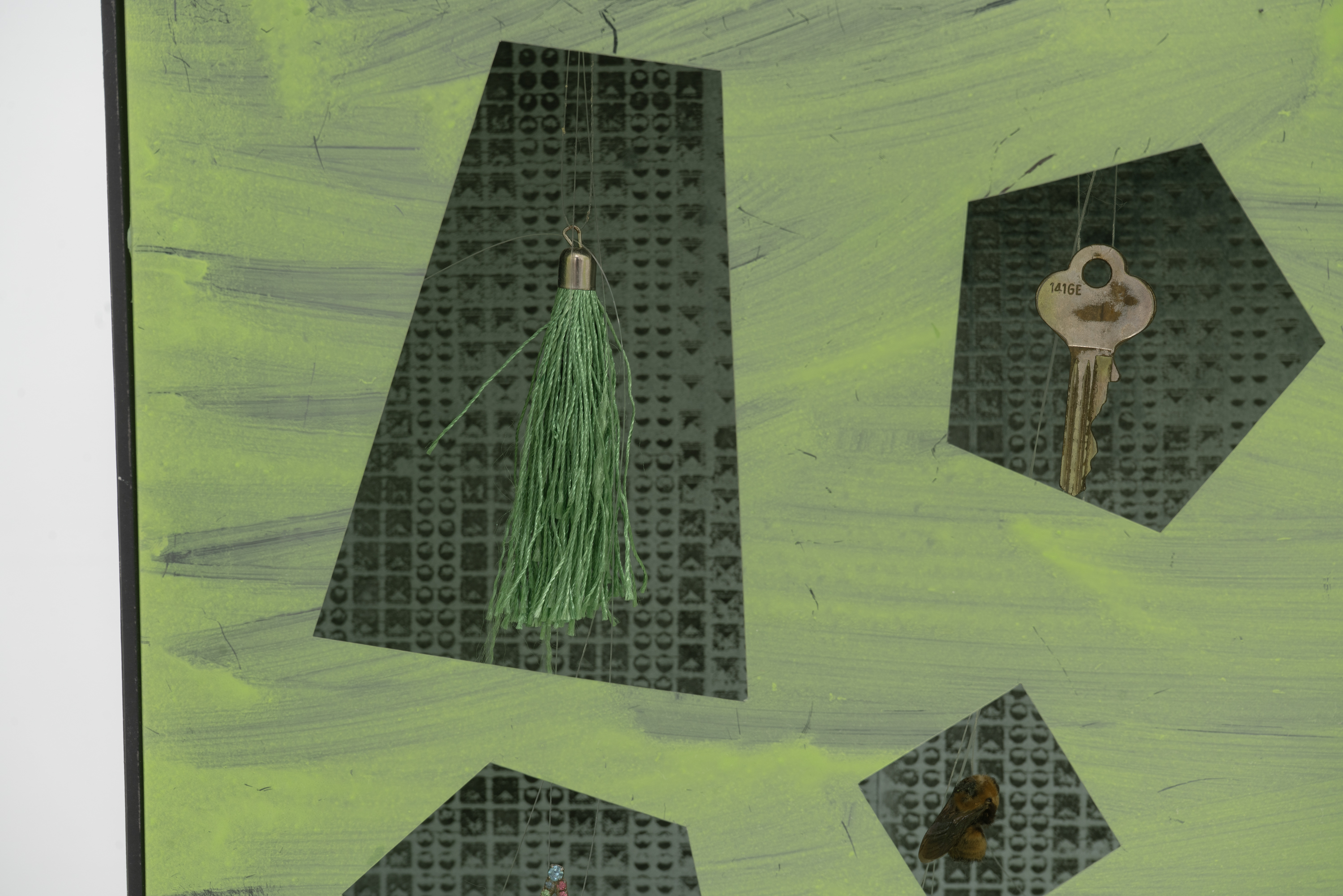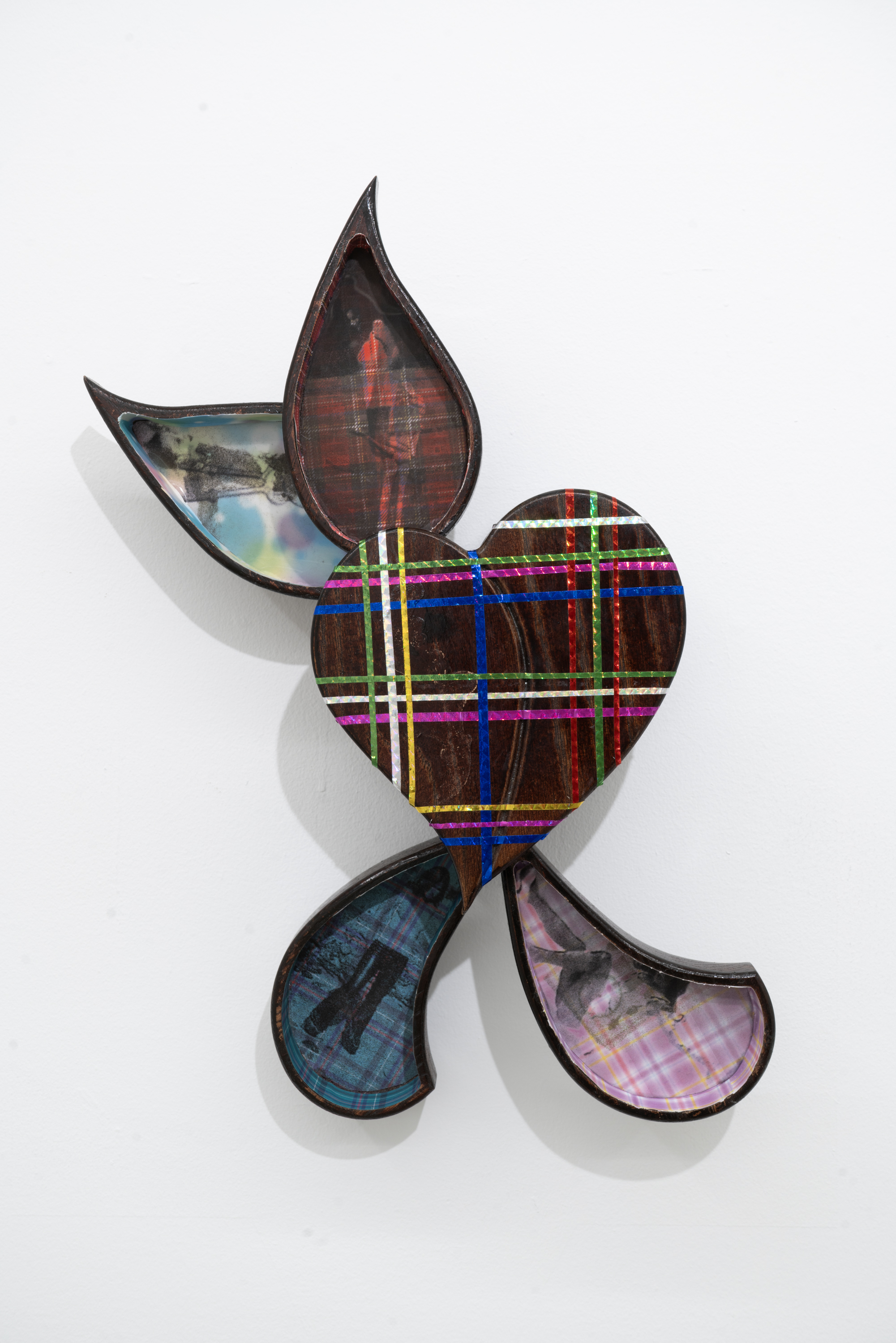 Isabella Kressin. Shimmering Information . Wood, fabric, inkjet print on transparency sheet, tape, glue. 2026