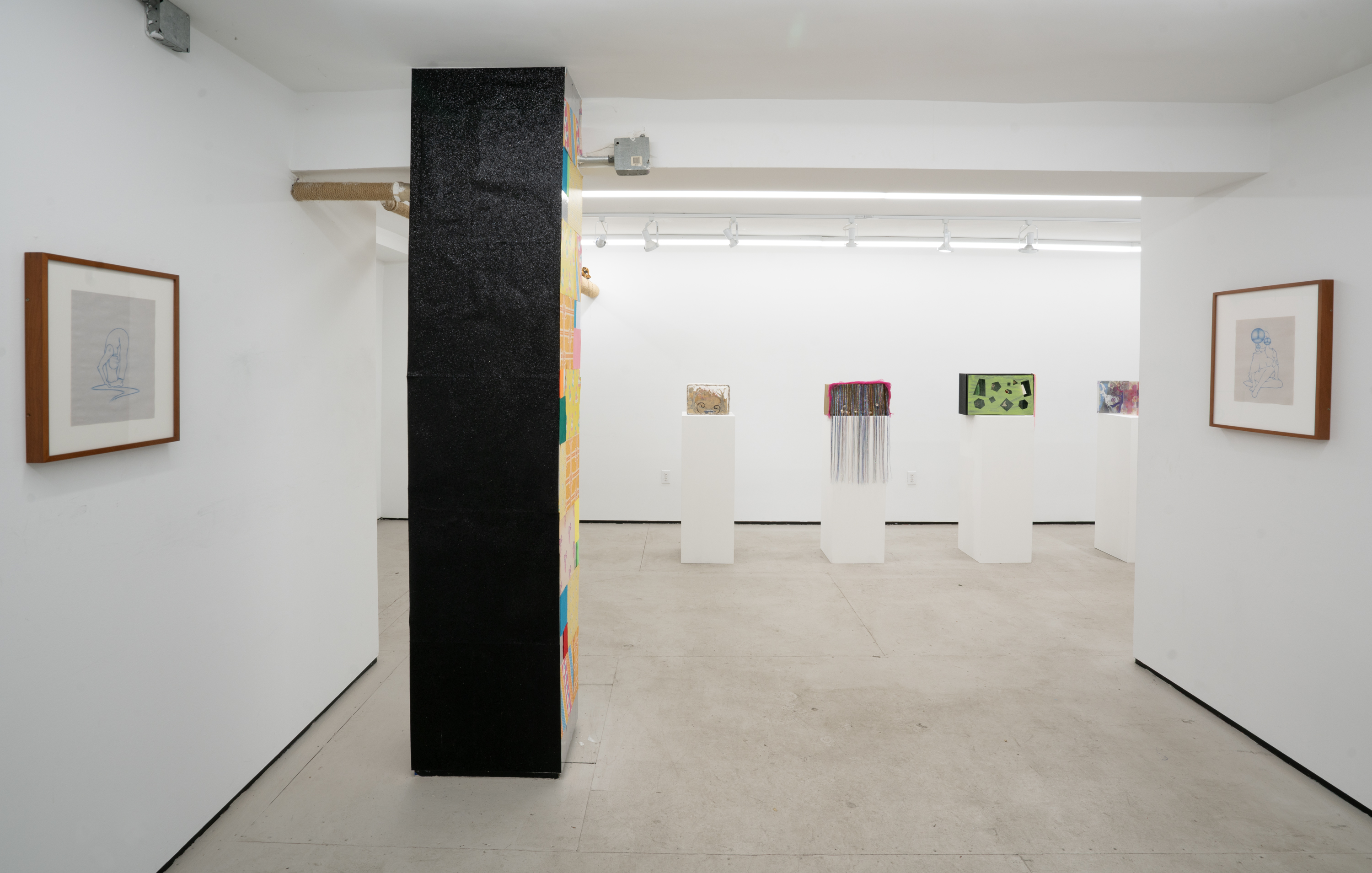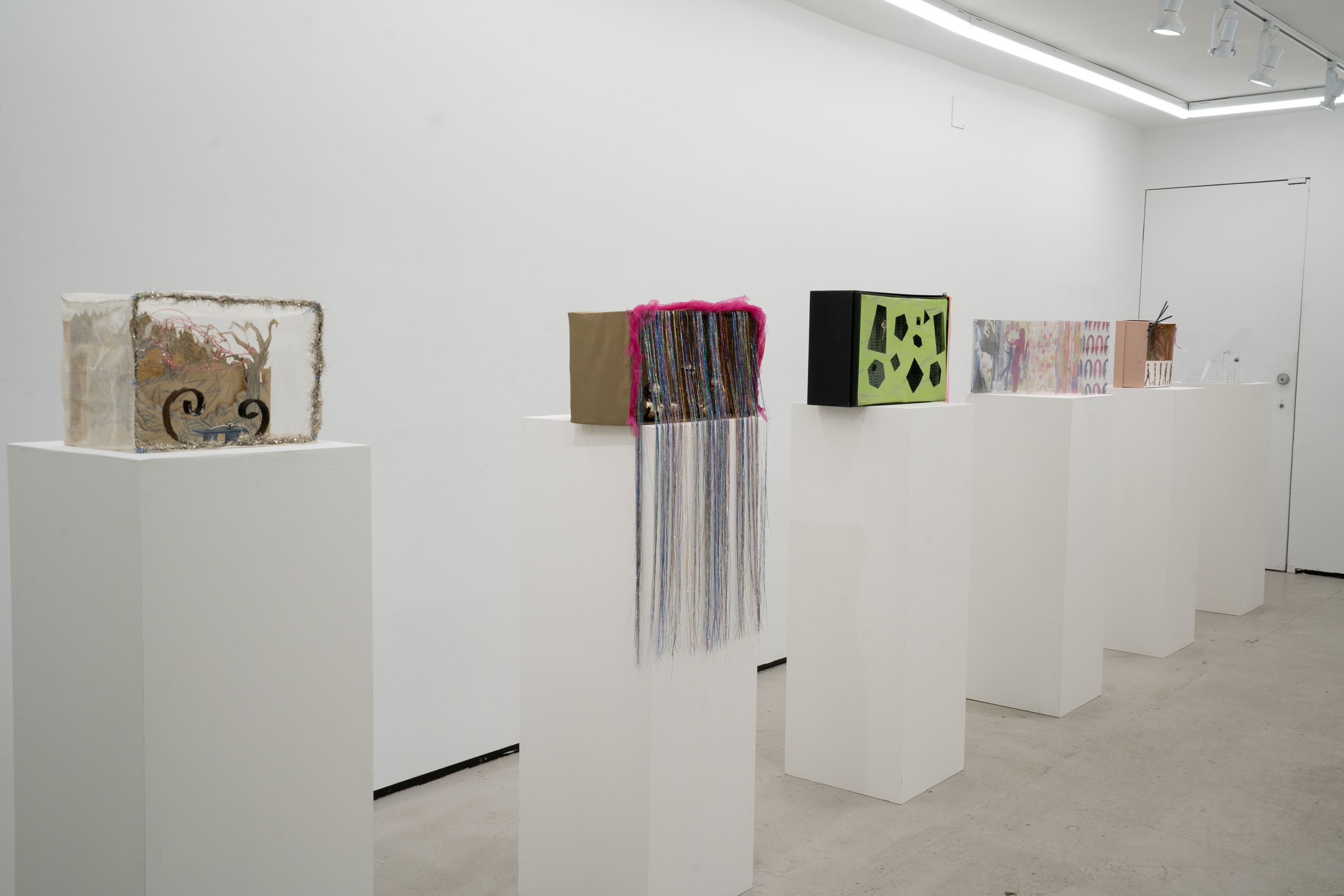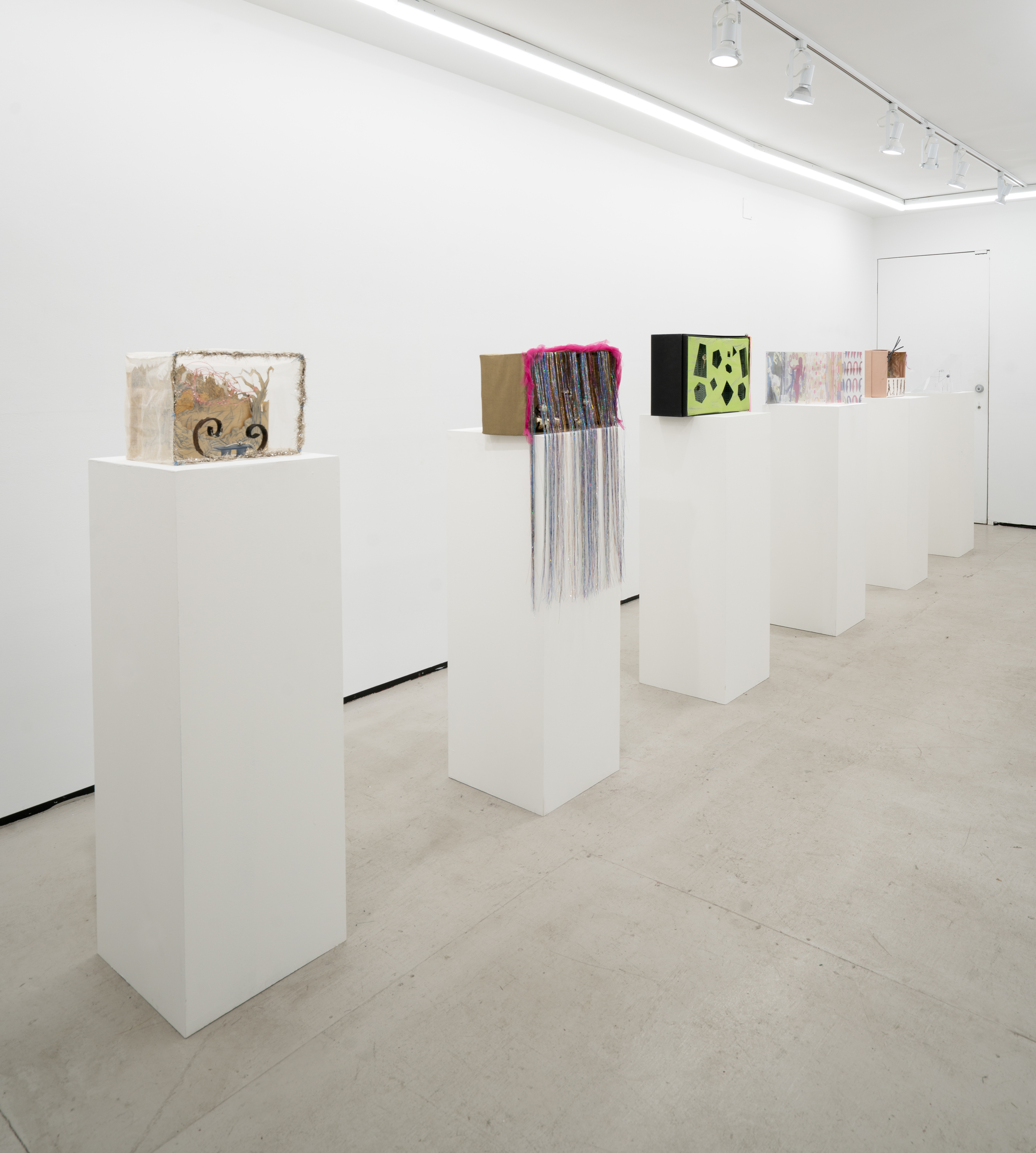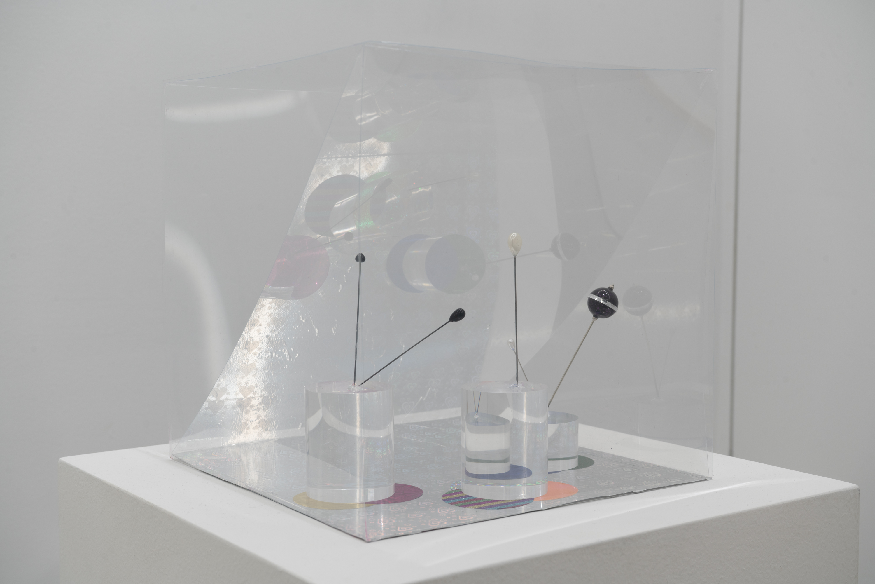 Isabella Kressin and Connor Bokovay. Behind the Pastille . Acetate, foil paper, acrylic pedestals, hat pins, resin, tape. 2026