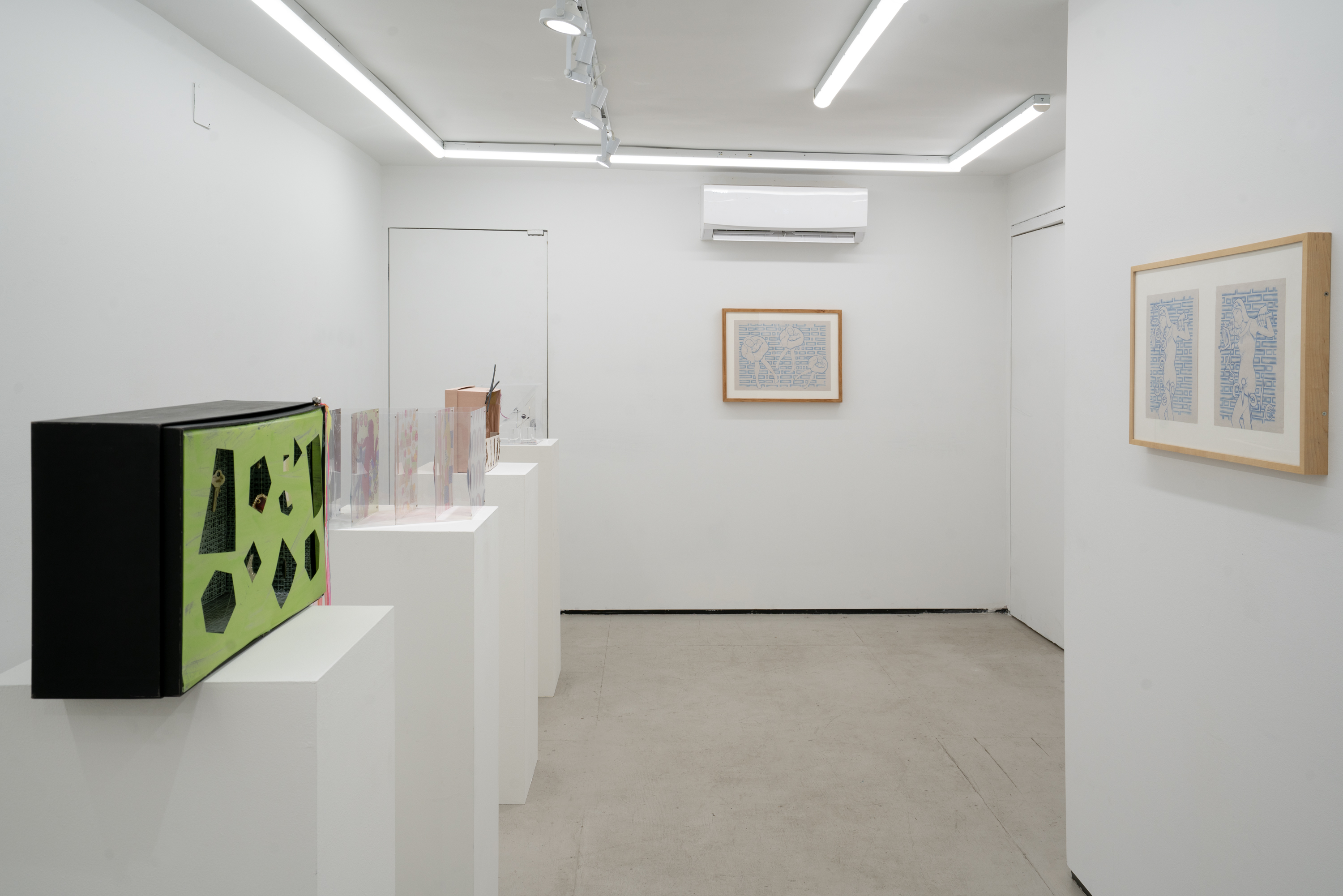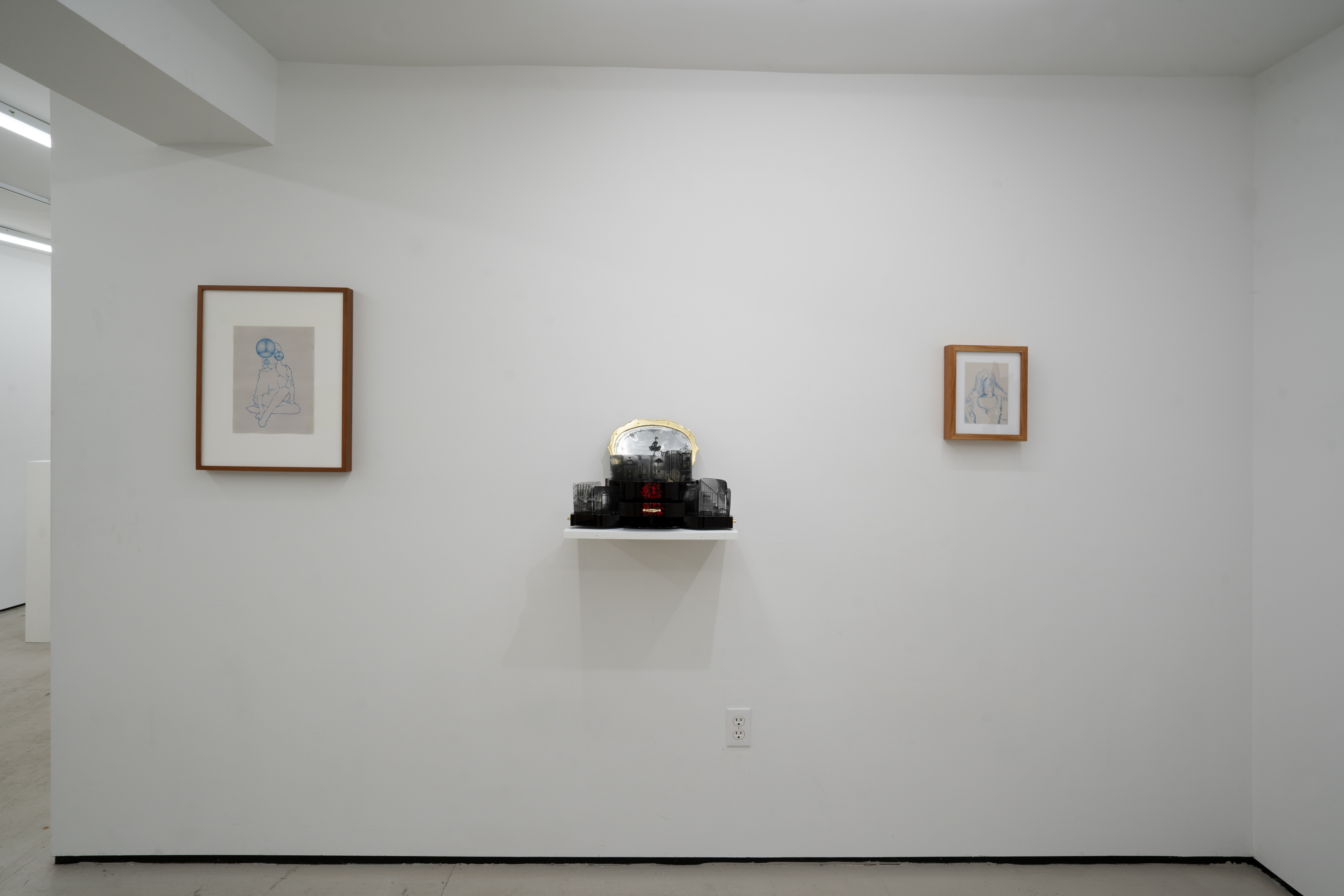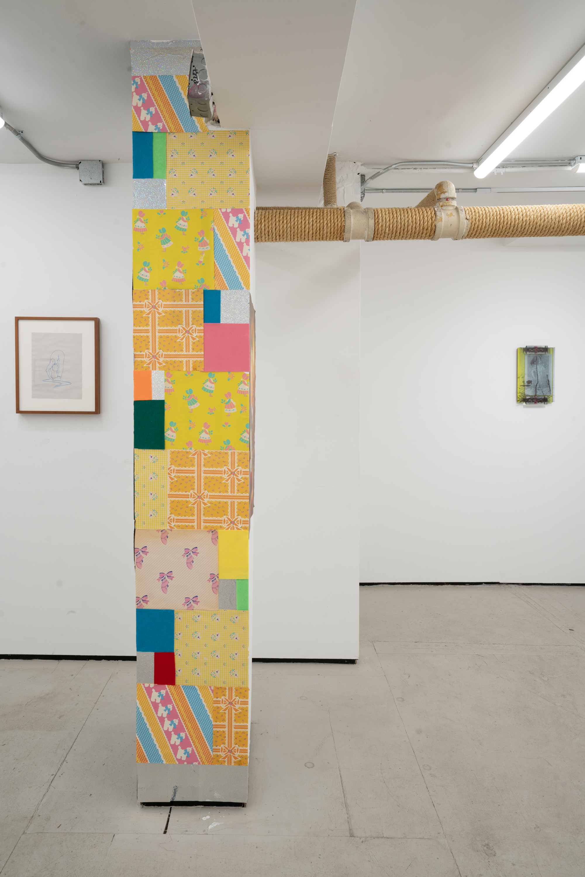 Isabella Kressin . Anonymous Blessing . Mirror, lucite, inkjet print on transparency sheet, window film, tape, drawing and ink on freezer paper. 2025